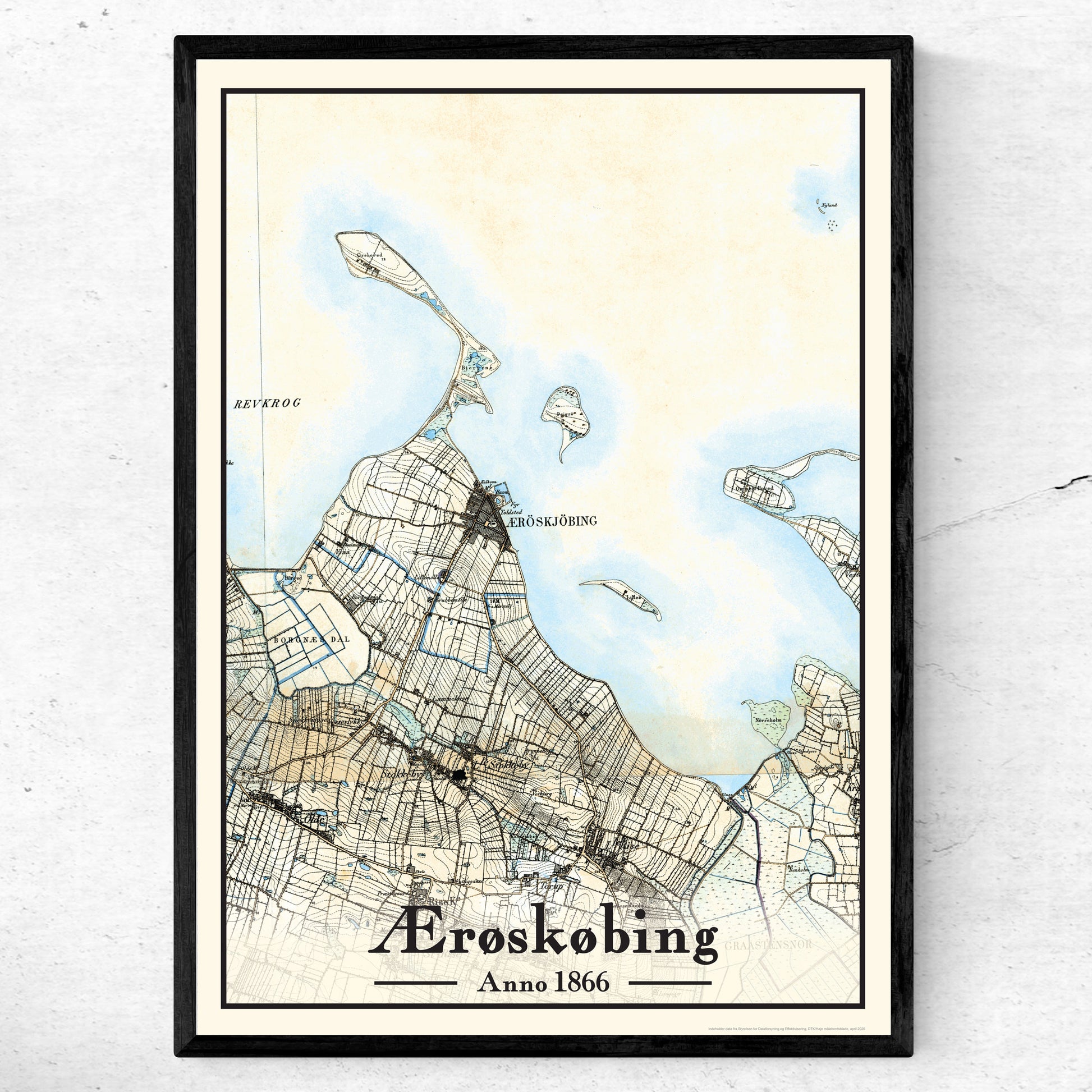 Tag på en rejse tilbage til 1866 med denne smukke plakat over Ærøskøbing. Det klassiske målebordskort er fyldt med detaljer, der inviterer til nærmere udforskning – uanset om du selv bor i området, eller blot holder af den historiske charme.
