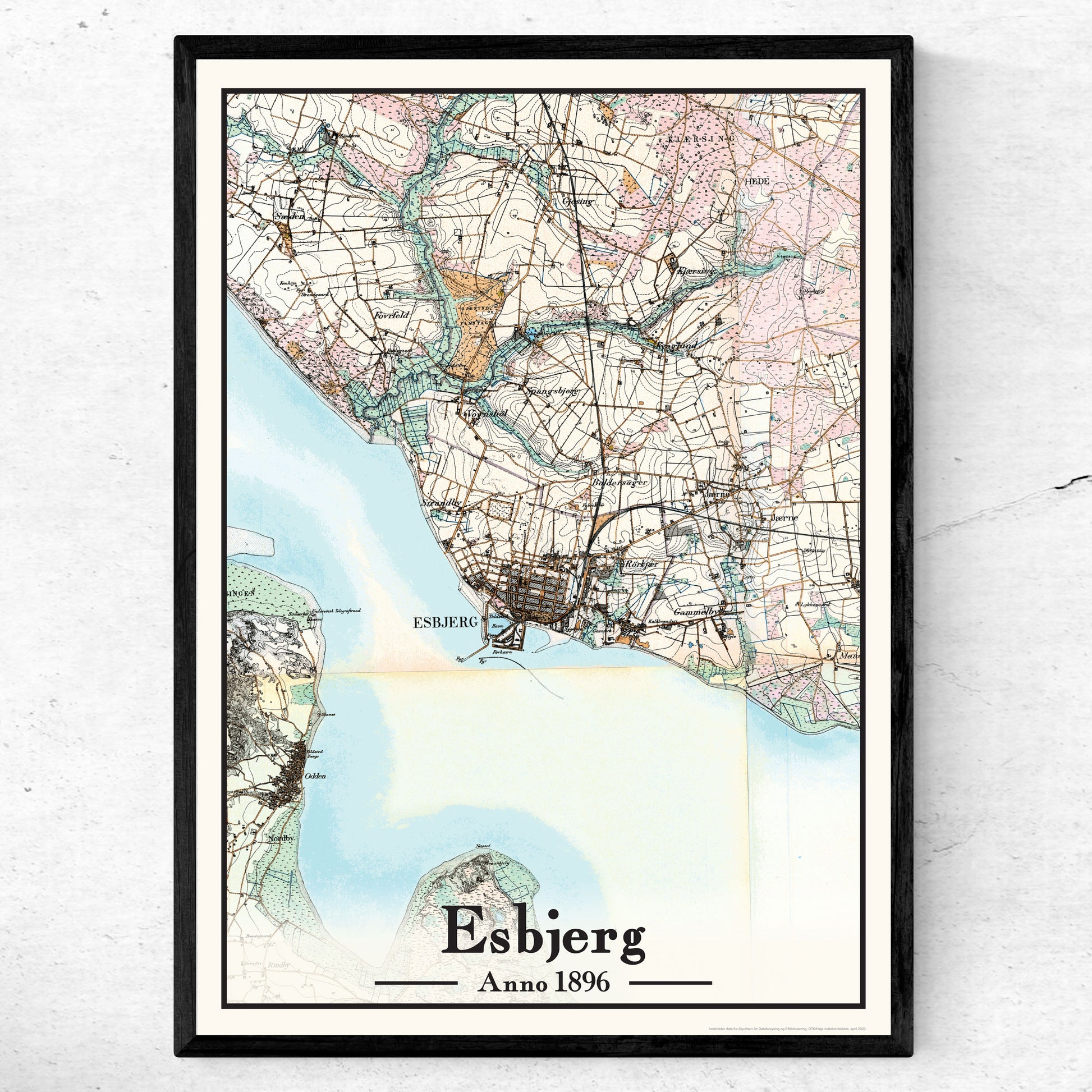 Denne historiske plakat viser Esbjerg, som byen tog sig ud i 1896 – og giver et fascinerende indblik i en tid, hvor byen for alvor begyndte at vokse. Det klassiske målebordsblad gengiver Esbjerg med stor nøjagtighed og en smuk farveskala, der både pynter på væggen og vækker historisk nysgerrighed.