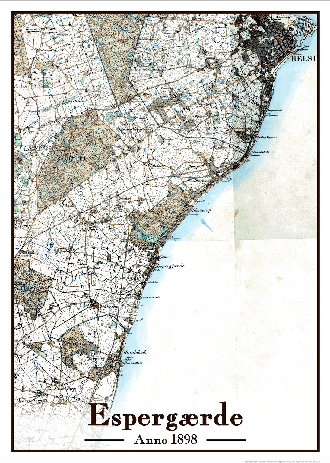 Når du studerer plakatens detaljer, kan du følge strandlinjen, opdage de tidlige bebyggelser og fornemme det landskab, som senere blev til en moderne stationsby. Samtidig giver kortet mulighed for at sammenligne Espergærde anno 1898 med byen i dag – og se, hvilke træk der er forandret, og hvilke der stadig består.
