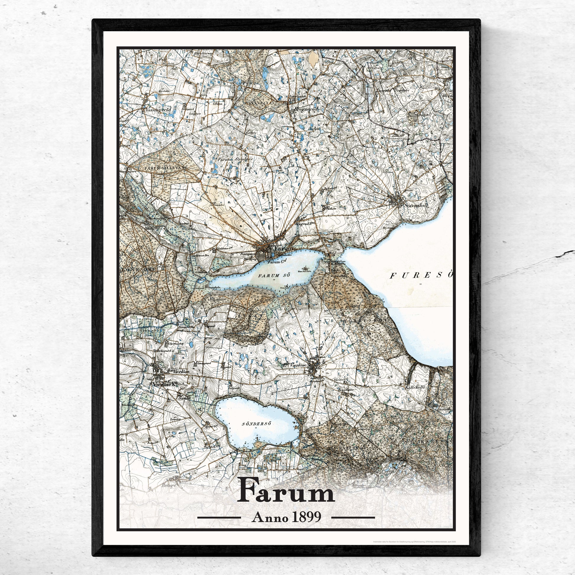 Dyk ned i Farums historie med denne smukke plakat, der gengiver byen, som den så ud i 1899. Den enkle og stilrene æstetik passer flot ind i både moderne og klassiske hjem, mens de mange kortdetaljer indbyder til nærmere udforskning.