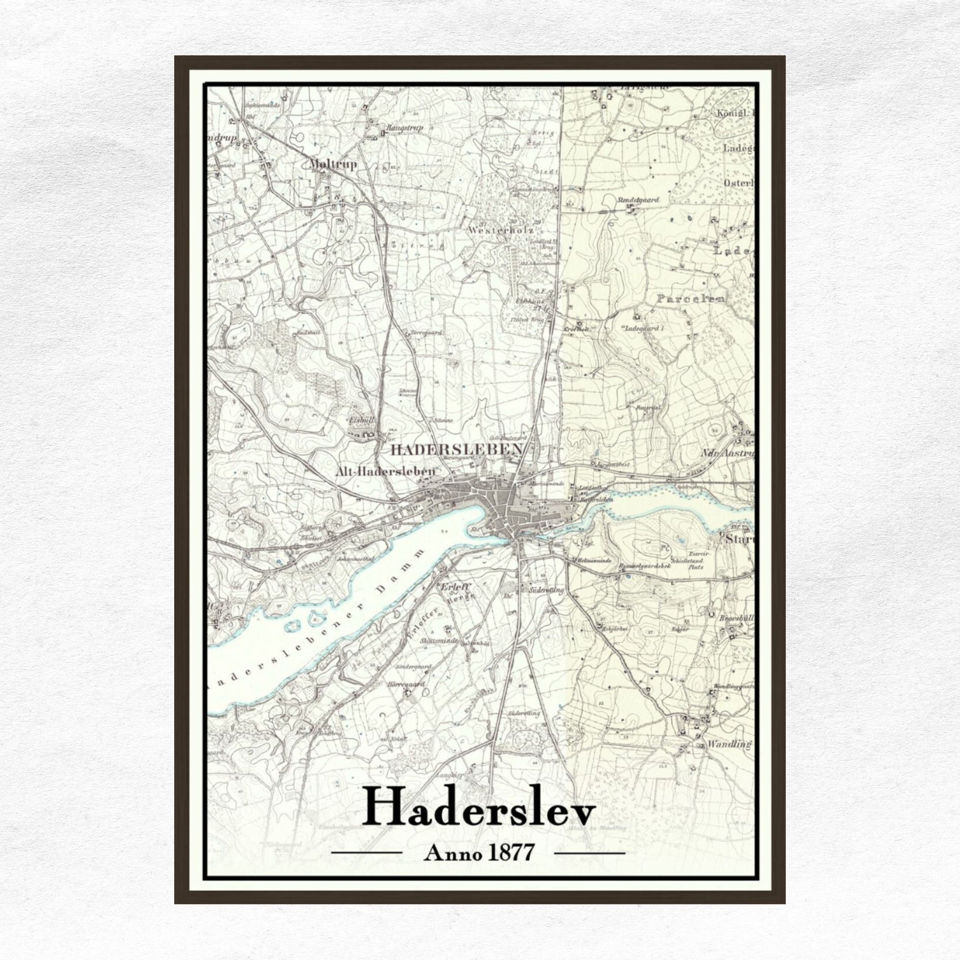 Plakatens tidløse udtryk gør den til et både dekorativt og historisk indslag i hjemmet – perfekt til alle, der har en særlig tilknytning til Haderslev eller blot fascination for danmarkshistorien fortalt gennem kortets stille poesi.