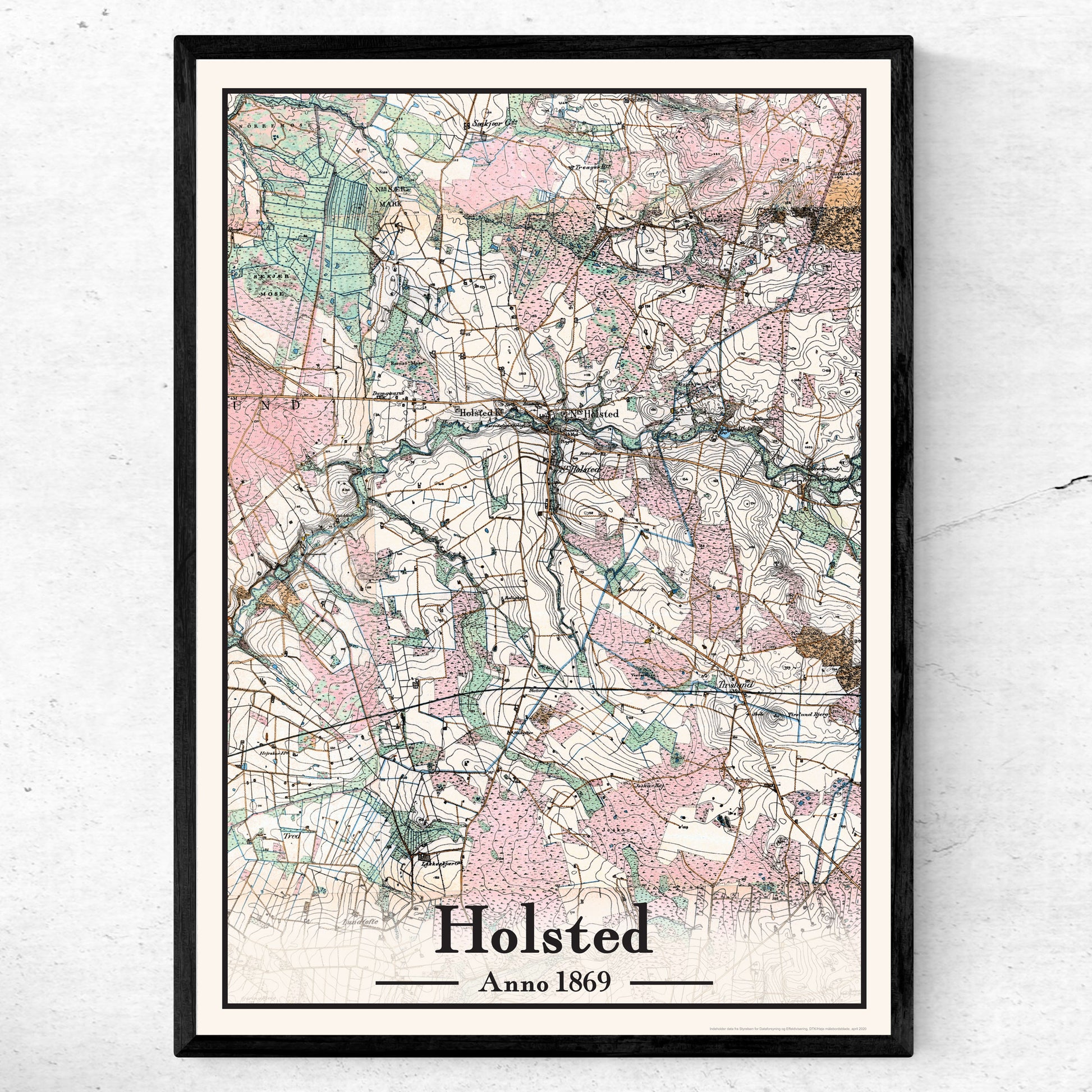Oplev Holsted, som byen og området omkring så ud i 1869, med denne smukke og historisk præcise plakat. Den enkle og tidløse stil gør den til en flot tilføjelse i både moderne og klassiske hjem, mens kortets detaljerige indhold indbyder til fordybelse.