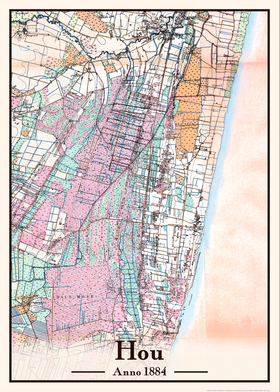 Tag et visuelt tilbageblik på Hou, som byen og oplandet tog sig ud i 1984, med denne flotte og historisk nøjagtige plakat. Den rolige og enkle stil gør den velegnet til alle typer boligindretning, mens kortets mange detaljer indbyder til nysgerrig fordybelse i lokalhistorien.