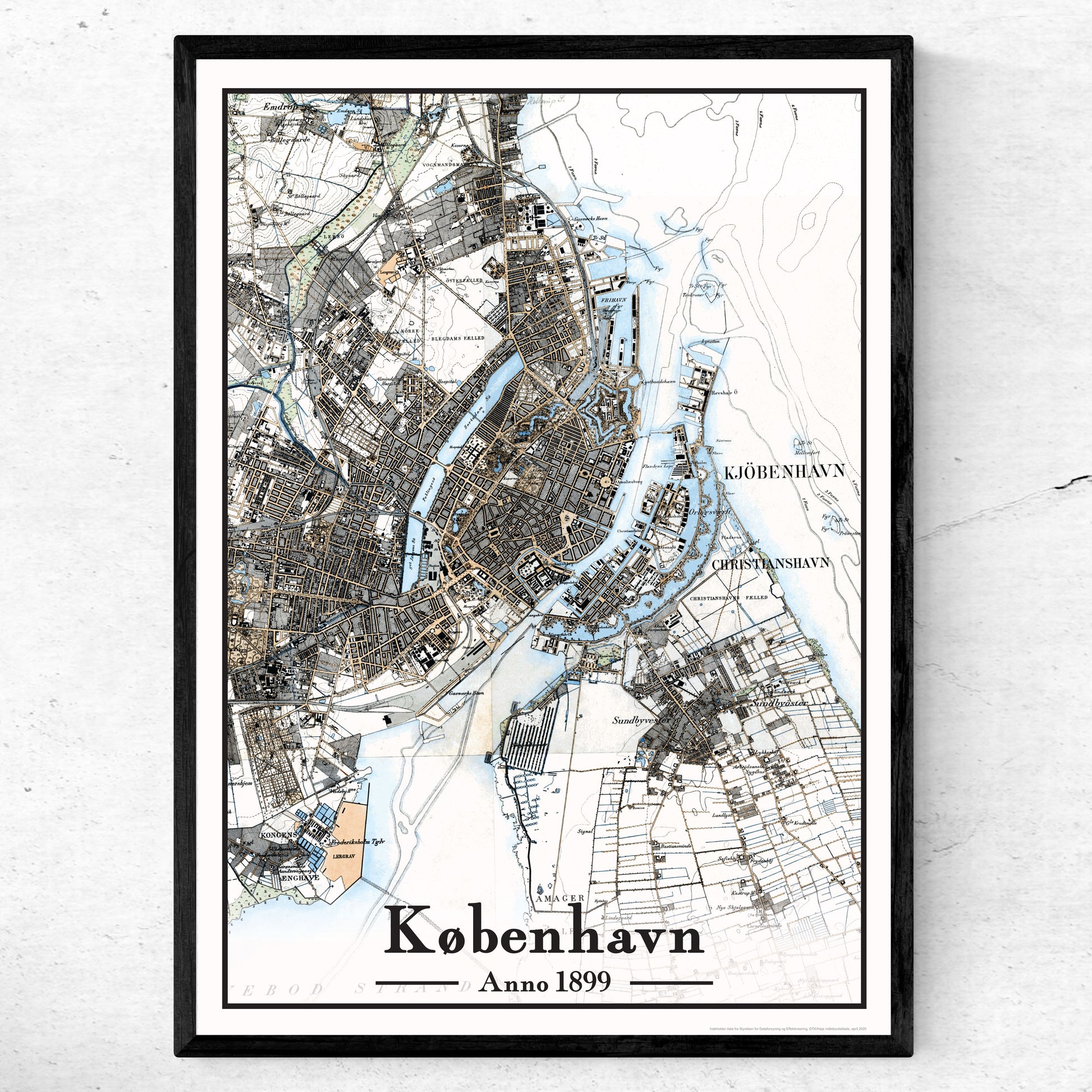 Oplev København, som hovedstaden tog sig ud i 1899, med denne smukke og detaljerige plakat. Med sit enkle og klassiske design passer den elegant ind i både moderne og traditionelle hjem, mens kortets mange detaljer gør det til en fascinerende historisk kilde.
