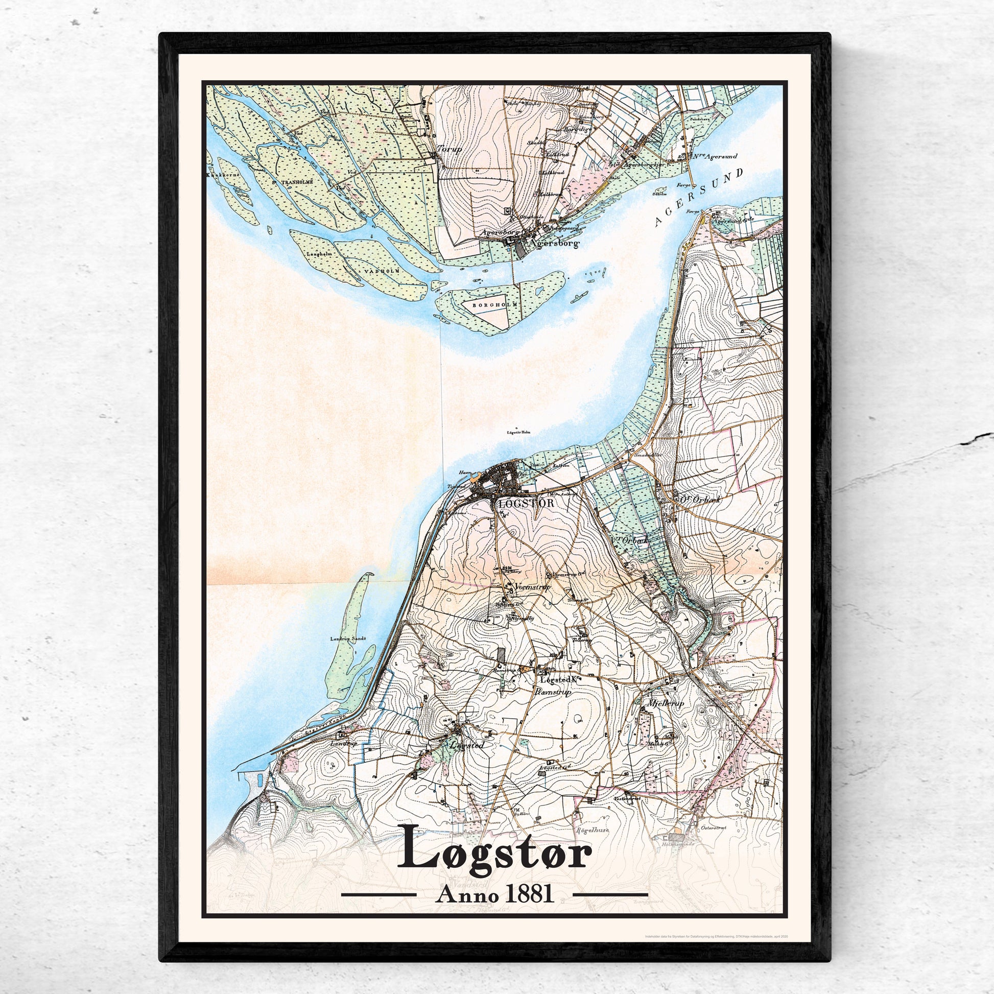 Det anvendte målebordsblad er både farverigt og præcist, og giver dig mulighed for at sammenligne Løgstør dengang og nu. En særlig detalje er Frederik den VII’s kanal, som blev færdiggjort i 1861 for at lette skibspassagen gennem det lavvandede Limfjordsområde.