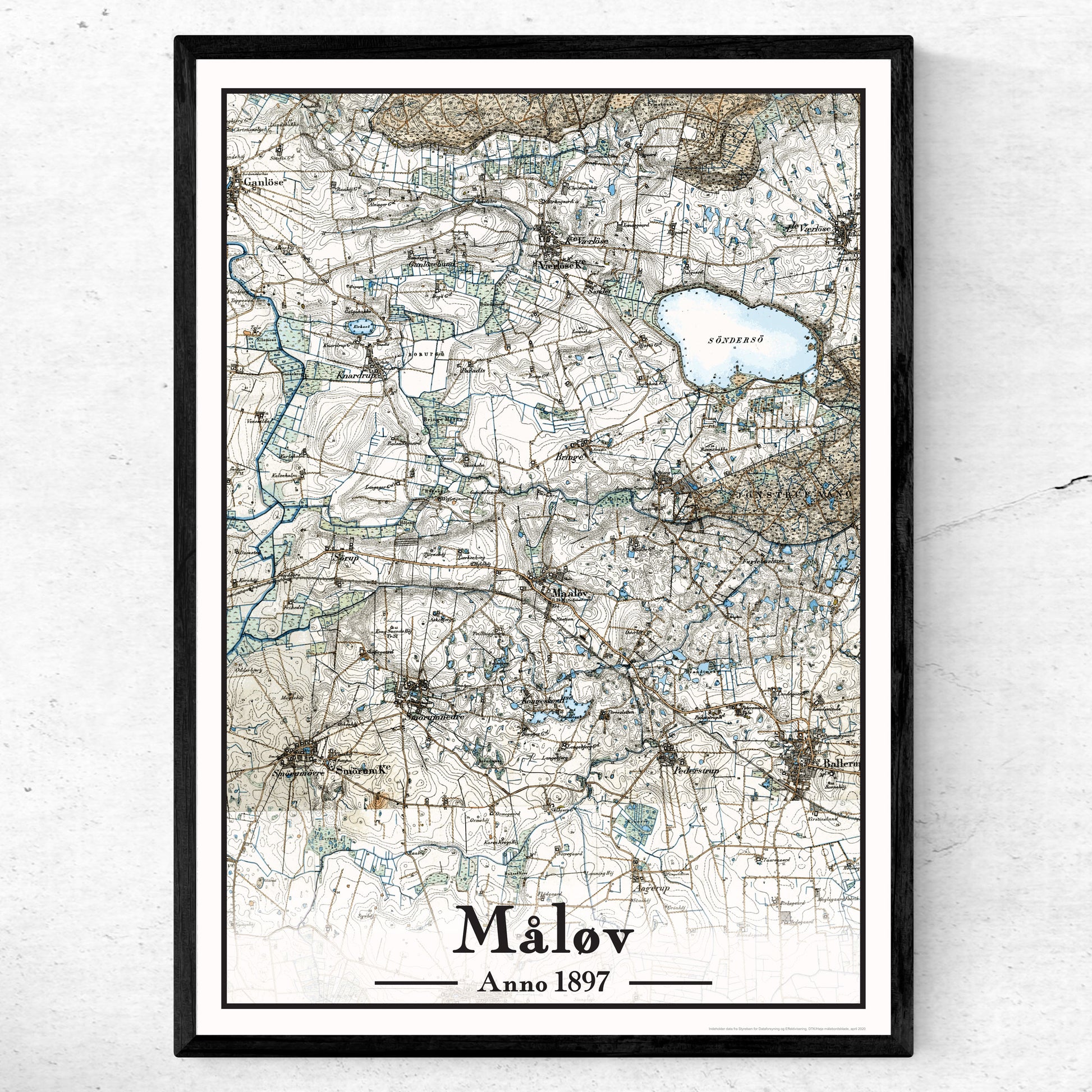 Denne smukke plakat over Måløv anno 1897 forener historisk autenticitet med et æstetisk udtryk, der passer ind i ethvert hjem. Den enkle stil giver et roligt visuelt udtryk, mens kortets mange detaljer indbyder til fordybelse i lokalområdets historie.