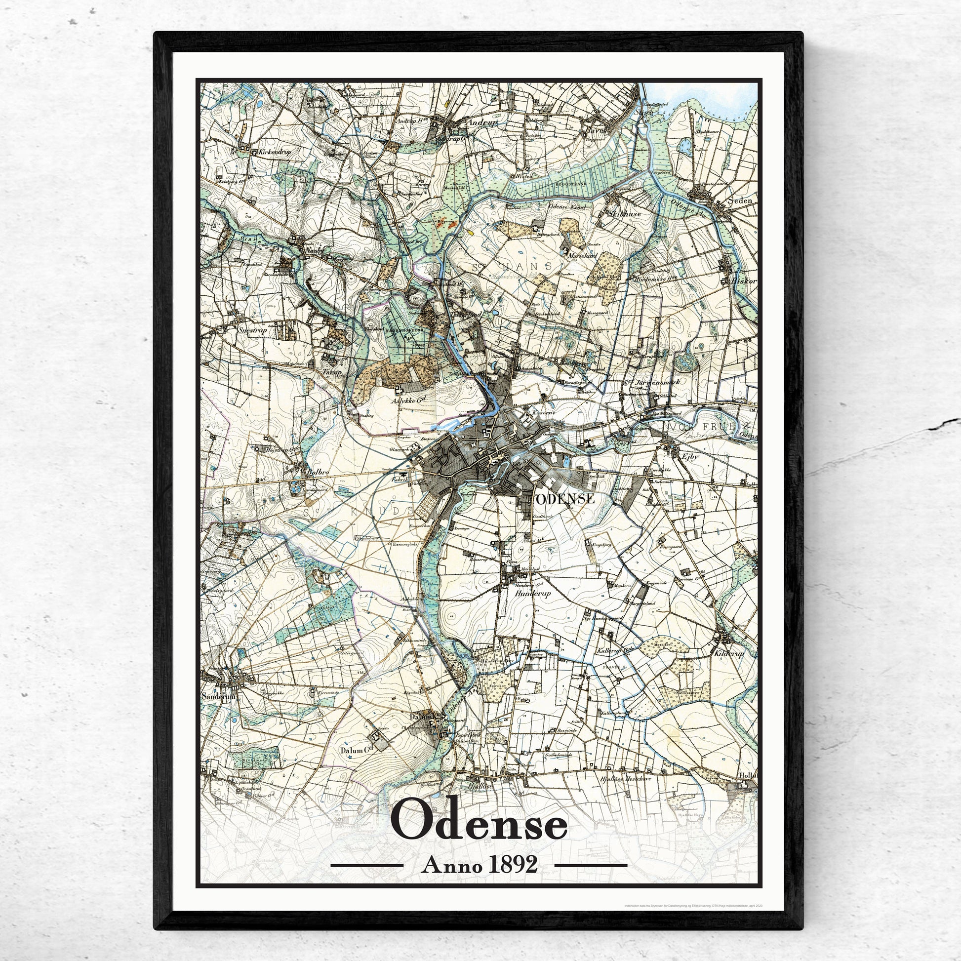 Denne smukke plakat viser Odense, som byen tog sig ud i 1892, og forener historisk indsigt med æstetisk elegance. Med sit enkle og tidløse udtryk passer den perfekt ind i enhver boligindretning, mens kortets mange detaljer gør det til en fascinerende kilde til lokalhistorisk fordybelse.