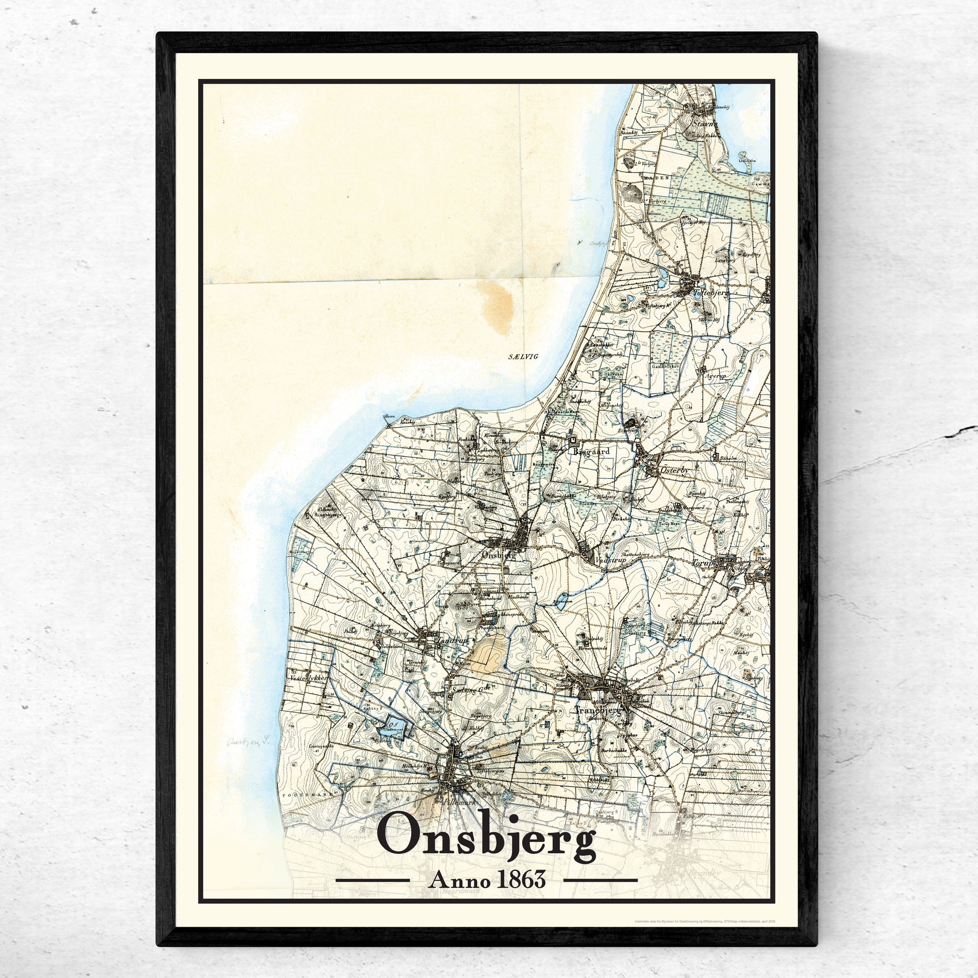 Denne smukke plakat viser Onsbjerg på Samsø, som byen tog sig ud i 1863, og forener klassisk æstetik med lokalhistorisk dybde. Det enkle og tidløse design passer elegant ind i de fleste hjem, mens kortets mange fine detaljer indbyder til fordybelse i Samsøs historie.