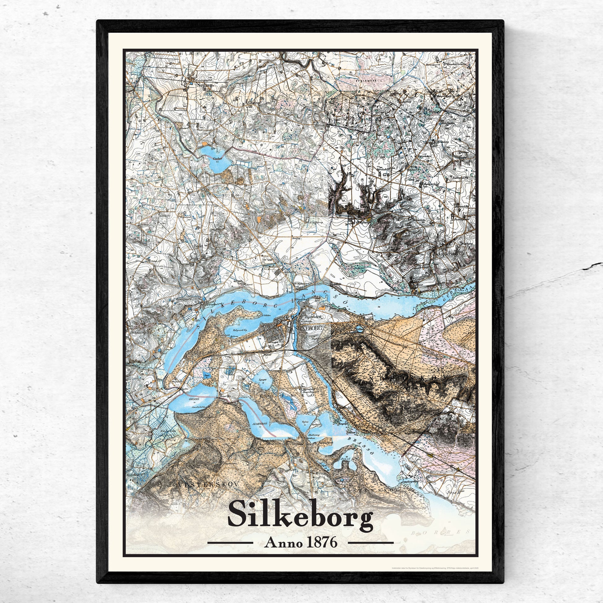 Byplakat af Silkeborg anno 1876. Det høje målebordskort er utroligt smukt med mange detaljer og flotte farver, og den høje præcision gør det nemt at sammenligne, hvordan byen har ændret sig over 100 år, og hvad der stadig består.