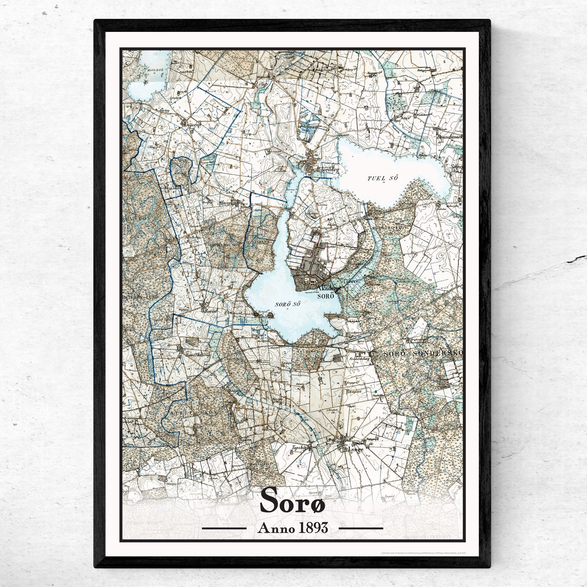 Byplakat af Sorø og omegn anno 1893, smukt gengivet efter det historiske Høje Målebordskort.