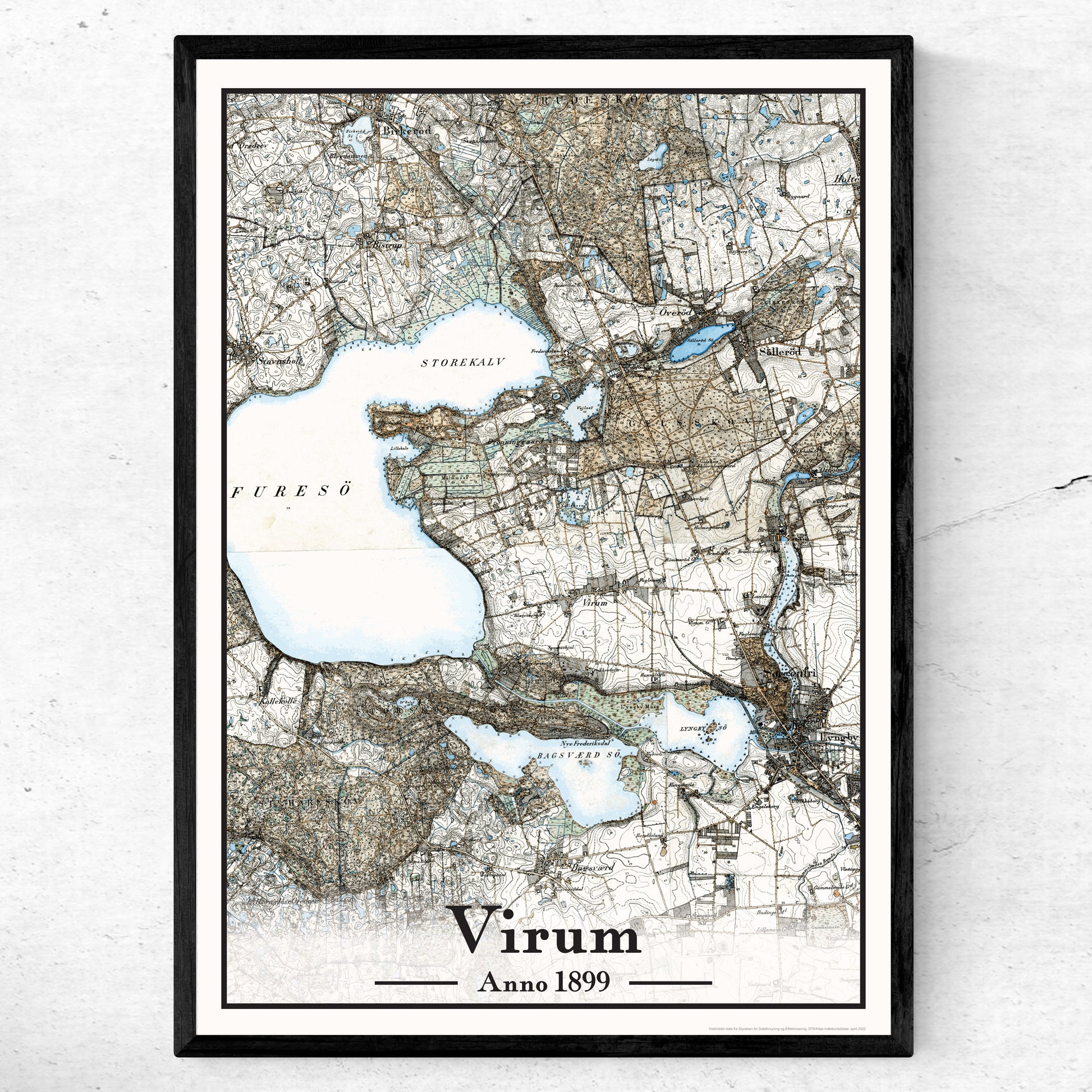 Tag et kig tilbage til Virum, som det så ud i 1899, med denne smukke og stemningsfulde plakat. Den enkle stil gør, at den passer ind i de fleste hjem, mens de fine detaljer indbyder til fordybelse i byens historie.